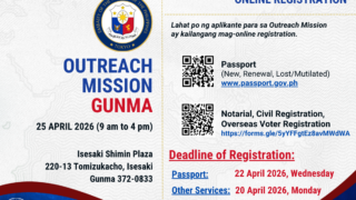 OUTREACH MISSION IN GUNMA 📅 25 April 2026, Saturday, 9AM to 4PM Venue: Isesaki Shimin Plaza 220-13 Tomizukacho, Isesaki, Gunma 372-0833 📌 Lahat po ng aplikante para sa Outreach Mission ay kailangang mag-online registration. Passport: https://www.passport.gov.ph Deadline of Registration: 22 April 2026, Wednesday Other Services: […]